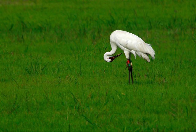 With this wild Whooping Crane with a tracking device on its leg, while the bird is