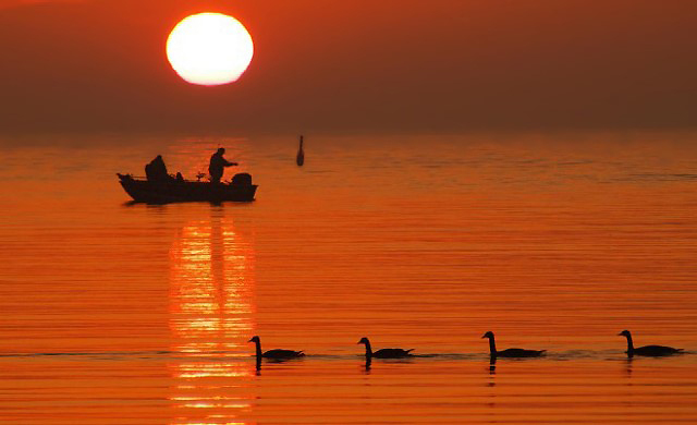 I was out photographing a Lake Michigan sunrise one morning when some swans came swimming into my picture frame. I switched my interest to the birds and then I realized that a pair of fishermen in a small boat came into the scene. I first changed my subject to the men, and then decided (an opinion) to include both of them in the picture. I metered off the most mid toned portion of the scene to retain the silhouette without making the photo so dark as to render the scene ugly.