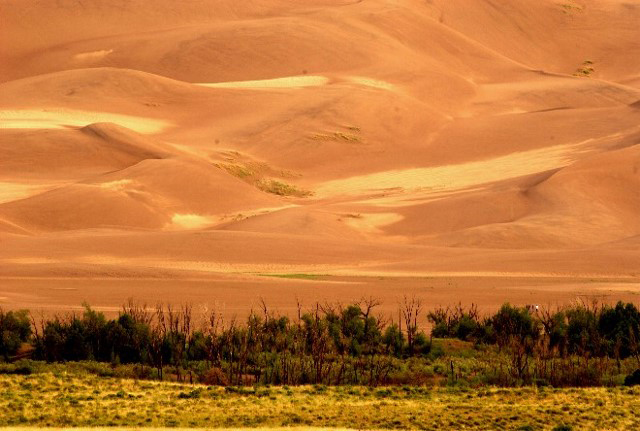 A fairly long lens rendered this sand dune landscape, more of an opinion and an aberration. Those dunes are over 400 feet high, but a shorter lens and a more “normal” perspective (I made several of those) would show their relationship to the foliage very differently. I chose to compose the image this way. Everything is sort of sandwiched. My decision therefore and my opinion. Beyond observation.