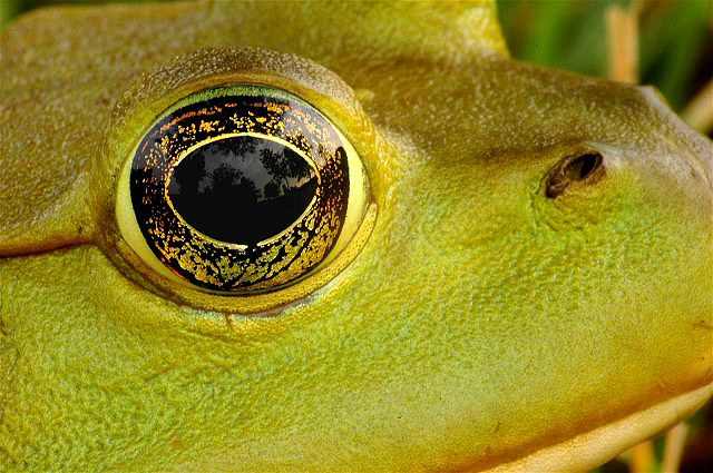 I have spoken of close-ups, and eyes. Well, Bull Frogs have great eyes. Why not make an image full of eyes. Especially when your subject is amazingly cooperative. The lens used, was my Nikon 105mm Micro.