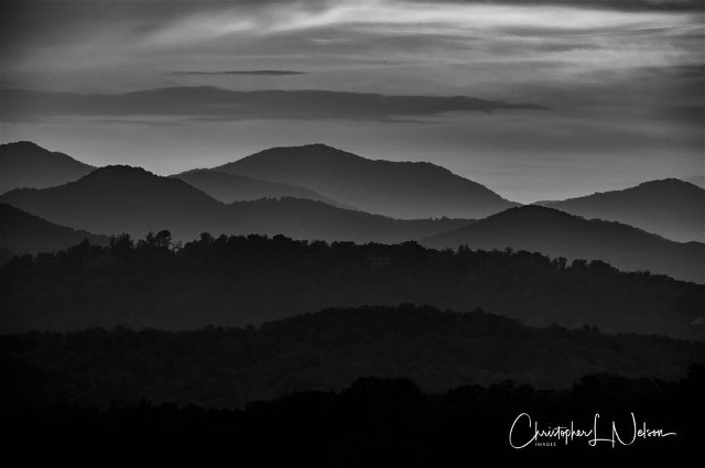 Christopher L. Nelson (no relation), made this mood provoking, monochromatic image of layers of light. One of my favorite subjects. He created the art along the Blue Ridge Parkway in Virginia. I have been fortunate to have been there myself, once as a child with my parents, and once with my pal Ron to make photos. Nothing I did comes close to Christopher’s rendition. The composition is breathtaking.