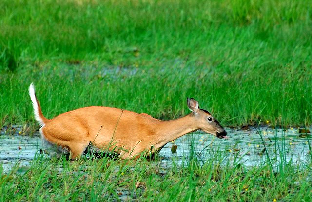 Those grasses which are covered in water, are sweeter and more tasty than the dry stuff. You can also cool off, and take a bath at the same time. Smart deer!