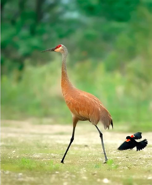 A Sandhill Crane crossed the path of a nesting Red-winged Blackbird and the Red-wing took issue with it.