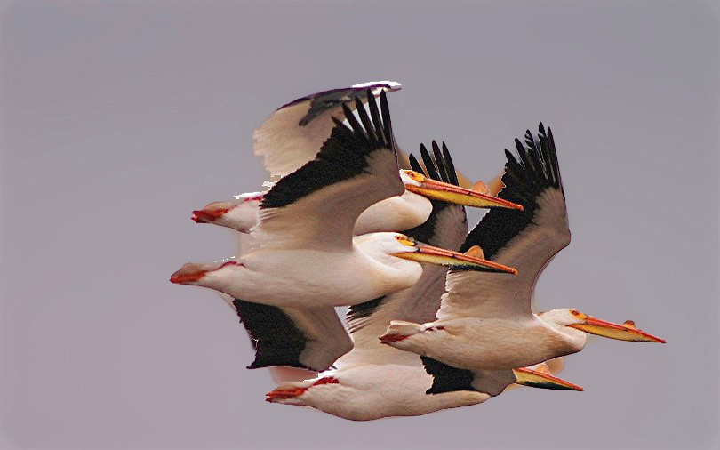 Most birds fly, therefore imagery made when they are flying, can be important. These guys were flying at what seemed like ridiculously close quarters. They did so without incident. They are American White Pelicans.