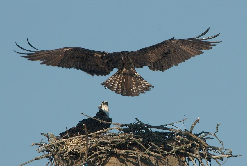 It was good to photographically stop this male Osprey in mid air, with a shutter speed of 1/640th sec doing the trick, while the female looked up as to seem to say, where’s dinner!! You know, the sushi!! The kids are hungry and so am I.