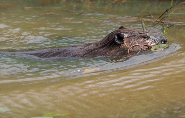 Most animals have some sort of “relations” with others. Cousins if you will. Such is the case below. The first is swimming with debris in its mouth as it is on the way to a half built Beaver dam. Which of course makes this critter a Beaver.