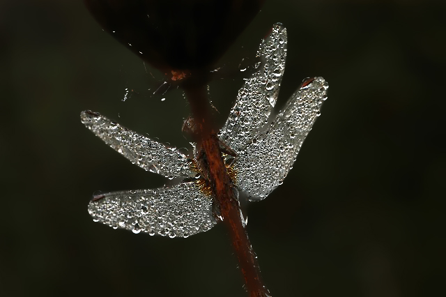 This dragonfly is wet. Really wet!! I love the deeply shaded background that produces obvious droplets, showing texture. Images like this are hated by some and loved by others, I love that nature provided “pop” !! I did add some contrast when editing.