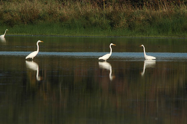 The photo below is of Great White Egrets in a pond, and is obviously not at the extreme edges of light. But still, the light is low level and the darkening background and the white birds with their reflections provide pop!. Overall, because of the subjects and what they are or are not doing, the photo becomes serene and peaceful.