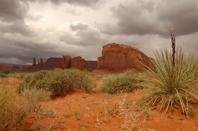 This shot is a bit different in what you normally see from Monument Valley Arizona/Utah. The iconic rock forms are underplayed in favor of some desert plants and a gray ominous sky.