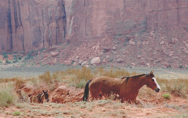 This is a mare and foal in Monument Valley. They are part of a herd owned by the Navaho Indians.
