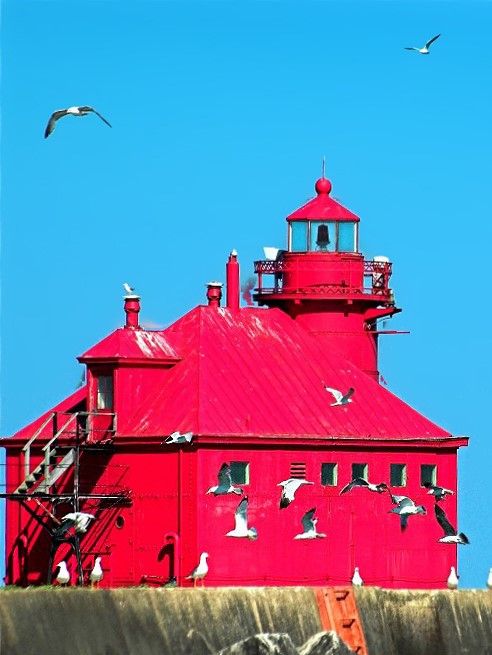 It is an historic Door, County, Wisconsin lighthouse. The gulls add some life to this old structure and the warm red building against the cool blue sky adds one of my favorite things, contrast. Contrast brings dimension and life to an image.