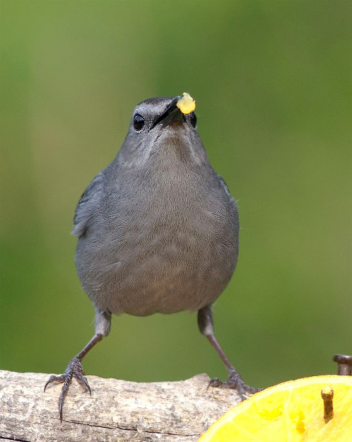 Bird feeding stations make for lots of picture opportunities. This male Gray Catbird looked me right in the eyes as it prepared to swallow a bit of fruit.
