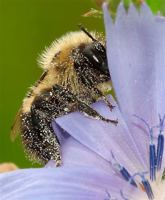 A lot of critters make use of flowers. This pollen covered bee and Chicory flower made a nice combo for a picture. Above all here, that bee needed to be crisp and sharp.