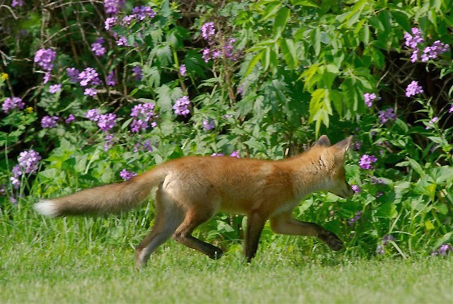 Small and distant flowers can help make images of primary subjects better. I caught this Red Fox kit trotting across this scene with some flowers in the background and I managed a few shots to combine them. Remember to pan your camera and tripod if in use, with the moving subject. A somewhat fast shutter speed was necessary not only for the fox, but to keep the flowers at least discernable. Also just deep enough of an aperture to keep the fox and flowers somewhat close to the same focal plane.