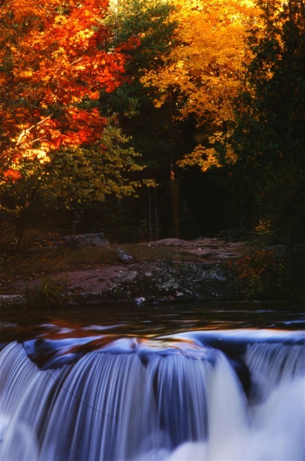 There are a lot of sorts of waterfalls. This one was photographed in Michigan’s Upper Peninsula and it also began as a film image. I do not remember whether I altered the composition once it was changed into digital or not, but it is hard for me to belief that this was not composed in this vertical format originally. There are three sections to this image, the water flowing over the edge, the dark bank made of rock, and the autumn colors being illuminated by the sun.