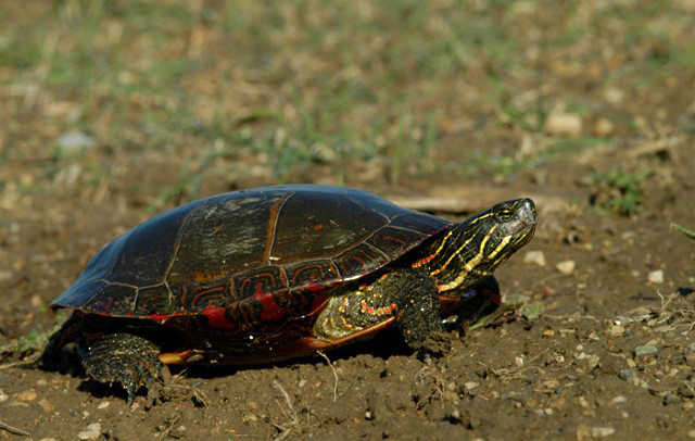 Okay, I love turtles and frogs. Below we have a Painted Turtle. It’s always a benefit to get down to their level if you can. Oft times, a fairly big telephoto lens will allow you to back off and give the subject some space, while leveling down the angle to appear as a close-up.