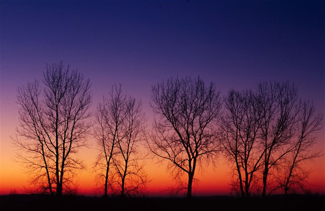 A steely bluish sky with a fiery sun just below the horizon can make for an awesome combination with leafless trees. Sometimes it is a benefit to ignore what we expect from a location and realize what is actually in front of us.