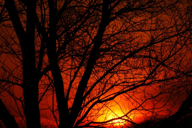Trees without leaves make for nice shapes. Craggy actually makes for nice shapes in general. I likely took a one percent spot meter reading from the bright spot where the sun peaks through. Yes, all of the branches, and the sun itself are all composed. There were of course many differing comps that could have been made.