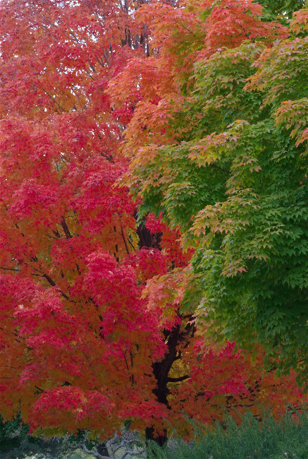 The play of fall colors (and a couple of dark conifers) in a forest, with