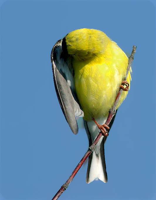 The beautiful (and he knows it too) male Goldfinch preening.