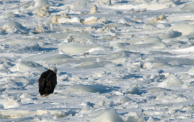 The frozen and snowed covered river below, this time holds a mature Bald Eagle instead of a young one as was the case before.