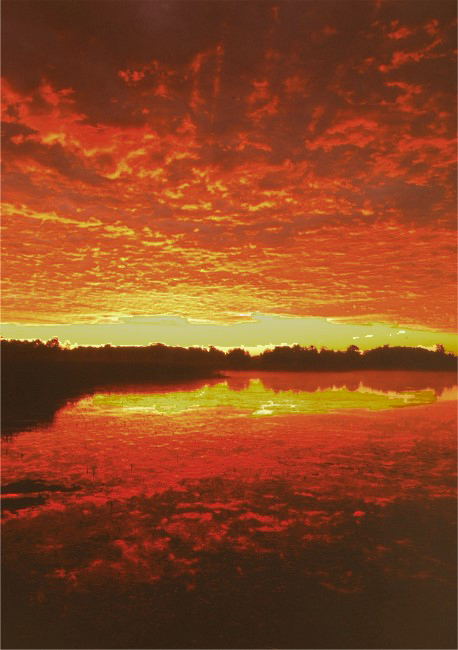 Below is a Wisconsin prairie at sunrise. Note how the silhouetted trees, bushes and grasses separate the warm color washes from one another.