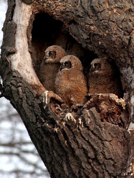 The early morning light can compliment a building or a tree, it also can work its magic on three little Great-horned Owl triplets.