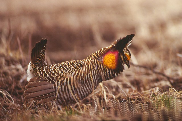 Ah the male Greater Prairie Chicken. This particular image was made from a blind very early on a cold Easter morning in the days of film. He was dancing for the ladies while my friend and I froze.