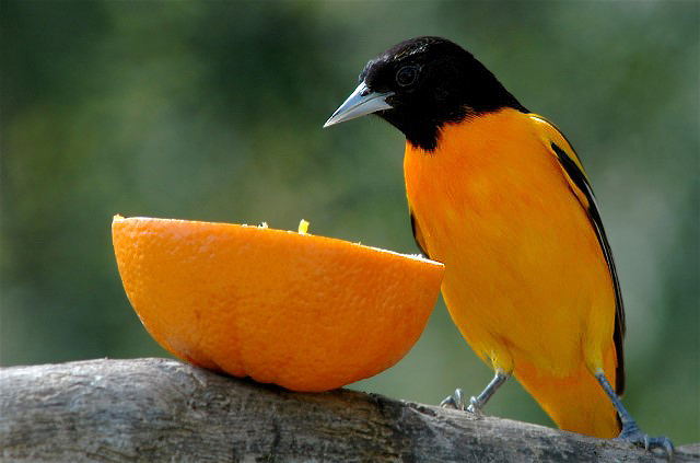 Bird feeding stations and enticements such as fruits, guarantee photographic success with critters like this handsome Male Baltimore Oriole. He gets fed, you get the picture.