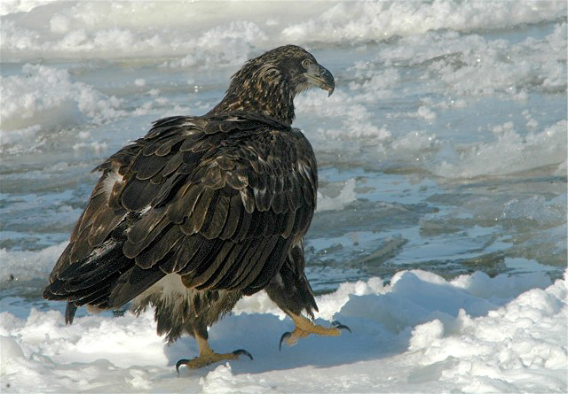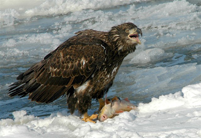 Feeding one’s self in the winter, can be a chore for an eagle. Searching the river ice (and snow) of winter is one place that an eagle can get lucky if you will.