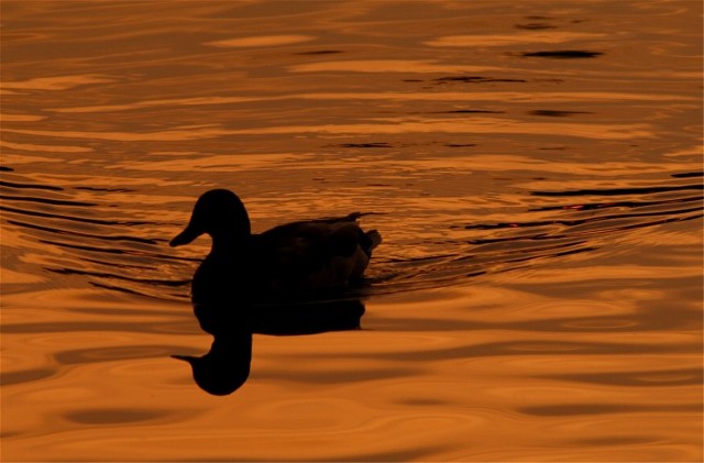 A swimming duck, might lack detail but gain a serene sort of beauty as it swims along creating a gentle wake at sunrise.