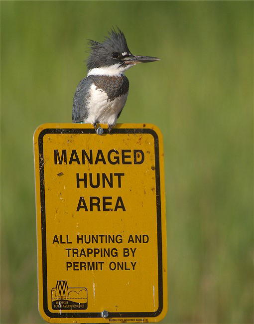 I guess, birds can’t read. At least the Belted Kingfisher we see below, whom I am quite sure is hunting for voles, mice, or some other little critters.