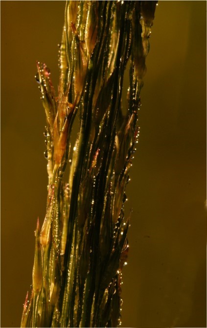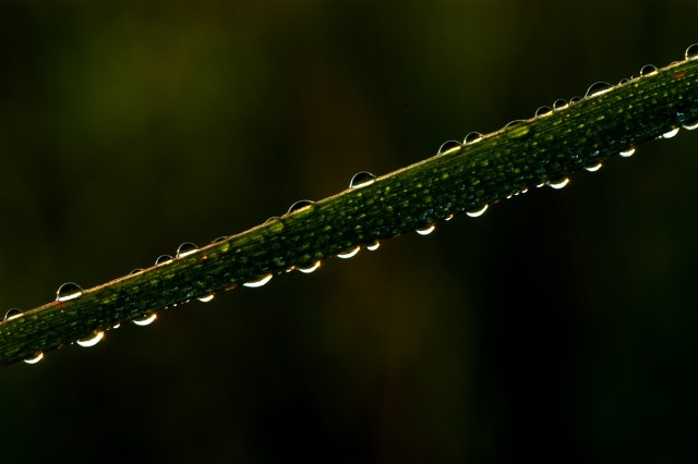 Just a long blade of grass with some dew. Fascinating light, and with a dark grassy background are also a part of it all.