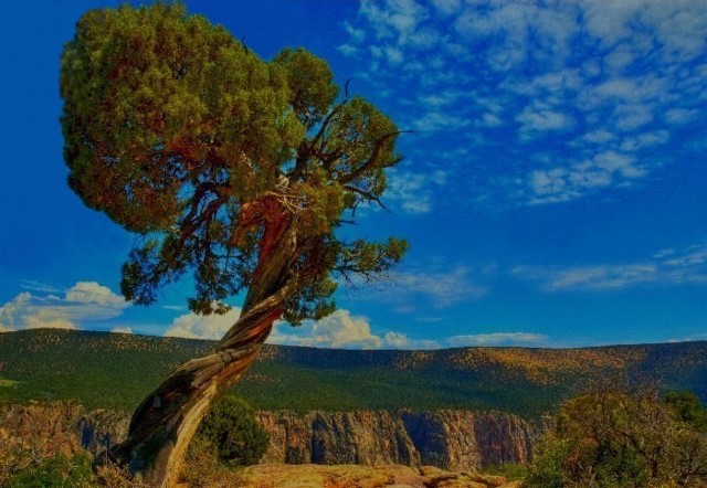 This colorful photo was made I believe at Colorado’s Black Canyon of The Gunnison. Obviously I was at the top of the canyon when I made this. Composing that tree off center left, was purposeful as the tree leaned to our right. The white clouds then helped fill the open space of blue sky.