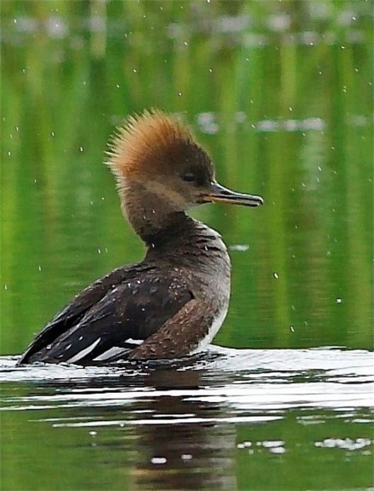 Get up on the water and run. This female Hooded Merganser is preparing to sort of run along the top of the water, and then lift into flight.