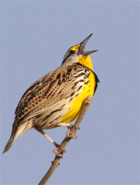 Here we find a male Eastern Meadowlark perched on a branch and I do believe, trying to attract a lady friend with a romantic song.