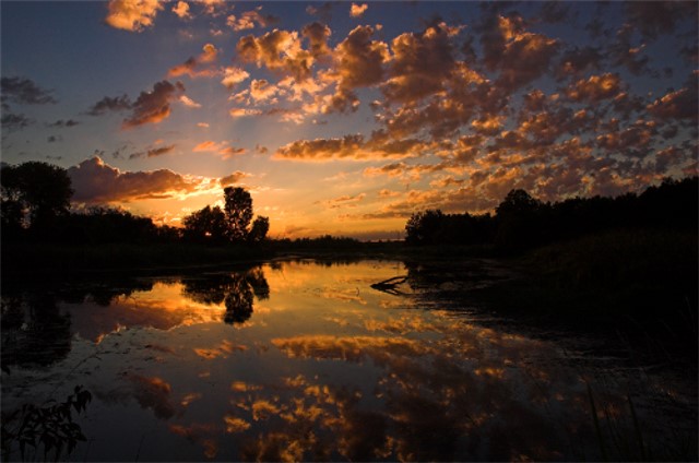 Below we find some of the most amazing light ever. This is a water inlet from Lake Michigan in Wisconsin. The clouds, the bank and trees, and the water and the light itself, were composed as best I could at sunrise.